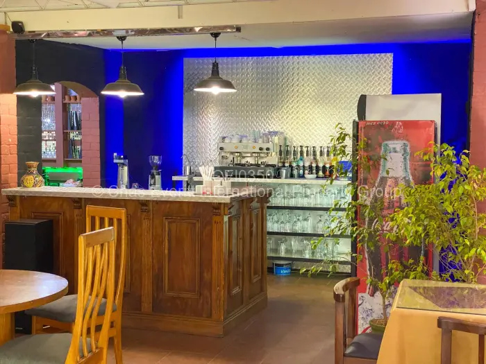 This charming restaurant available for rent in the suburbs of Bulawayo combines a cozy atmosphere with functional design, making it an ideal choice for your culinary venture. The main dining area welcomes guests with its rustic yet contemporary style, featuring warm terracotta-painted exposed brick walls that set a charming backdrop.