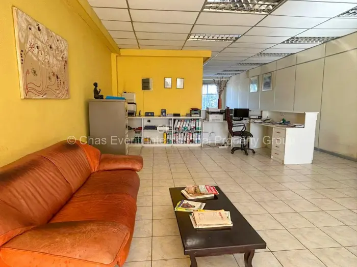 This commercial property boasts a vibrant reception area, adorned with bright yellow walls and sleek tiled flooring, providing a professional yet welcoming atmosphere for clients and visitors. The reception desk and stainless steel bench enhance functionality, while artwork featuring vivid landscapes adds a touch of creativity.