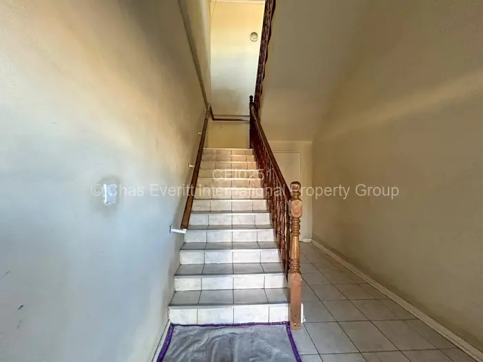 Features of this property include reliable municipal water, dependable Zesa, and a comprehensive CCTV system ensuring security. The charming staircase leads to potential office spaces, lined with smooth tiles and wooden bannisters that enhance safety.