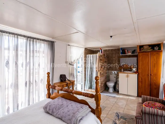 Beyond the main house, the property features two additional cottages. The first cottage is spacious and well-laid out, comprising an open lounge and kitchen area, a large master bedroom with an en-suite bathroom, and a second bedroom, also with its own en-suite perfect for extended family or rental income. The second cottage is a bachelor-style unit with an enclosed veranda, offering a private, self-contained space ideal for a single tenant or guest.