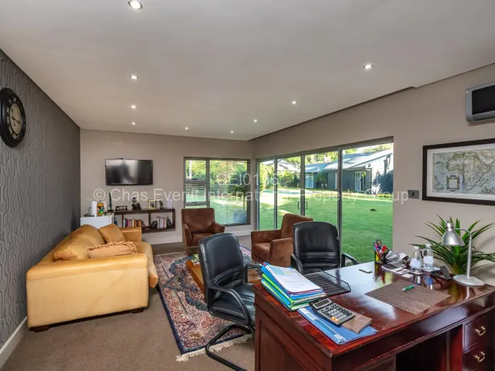 An aerial view reveals a well-maintained garden and a swimming pool, perfect for relaxing or recreational activities. With five spacious offices and separate accommodation for additional offices in the two additional structures on the property, this layout is designed for productivity and comfortable working environment. The modern conference room stands out, showcasing a sleek design with multimedia capabilities and an abundance of natural light pouring through expansive windows.