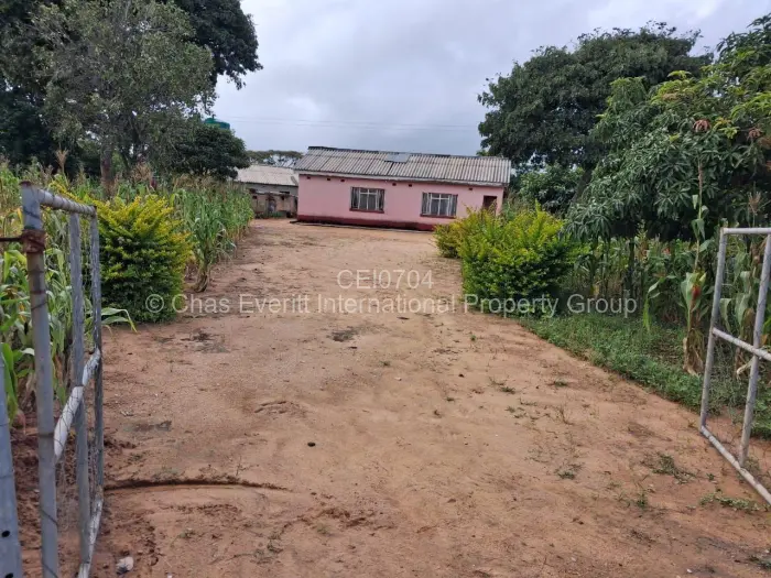 The exterior showcases a modest pink facade and a durable corrugated roof, complemented by multiple security windows. Access to the house features a basic porch area, creating a welcoming entrance. The surrounding greenery, which includes small shrubs and thriving crops, offers potential for agricultural pursuits.