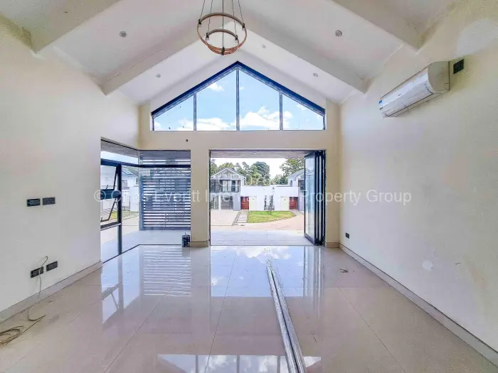The living areas are designed with an open-plan concept that includes a spacious lounge, dining area, and a well-fitted kitchen, complete with a four-plate gas stove and an oven. To ensure comfort throughout the home, both the lounge and main bedroom feature air conditioning.
