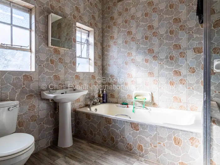 The bathroom is both practical and inviting, showcasing decorative stone-patterned tiles. Equipped with a bathtub, washbasin, and toilet, its well-appointed for daily use and enhanced by two windows for ventilation and brightness.