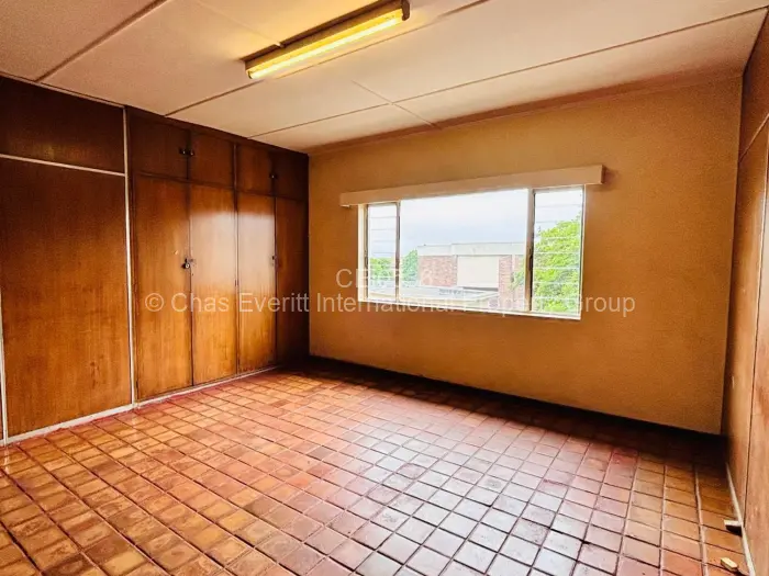 This office to rent in the CBD of Bulawayo offers a spacious and adaptable environment for businesses seeking a strategic location. The interior features a vintage aesthetic with charming wooden paneling and earthy tiled flooring, creating a warm and inviting atmosphere. The large square tiles complement the rustic charm, while bright fluorescent lighting ensures the rooms are well-lit and functional.