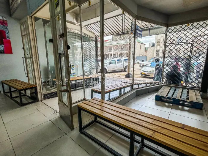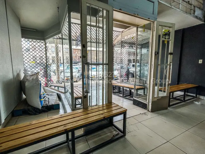 Discover a prime retail space to rent in the bustling heart of Bulawayo's City Centre. This modern retail unit boasts an inviting shopfront featuring large glass panels, inviting natural light while providing visibility for your business. A contemporary design welcomes customers with wooden benches perfect for those enjoying a moment of respite while exploring your offerings.